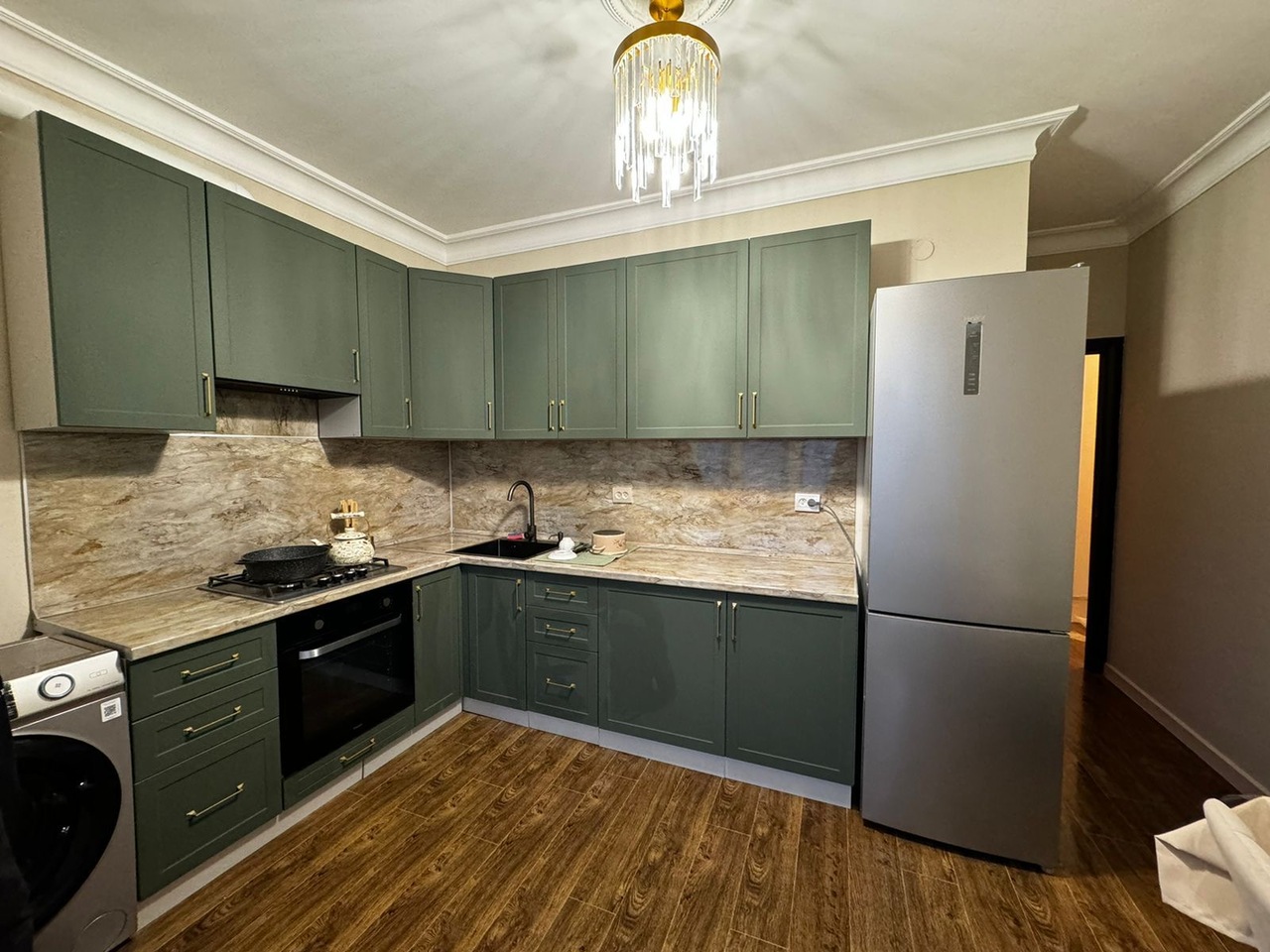 Район жилой,вся инфраструктура в шаговой доступности рядом: садики,аптеки,рестораны,кафешки,круглосуточные магазины🛍️